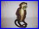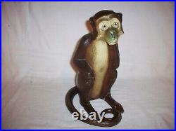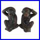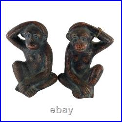 This is a unique pair of vintage very heavy mirror-image cast iron monkey/chimpanzees. They can be used as bookends, doorstop statues, or as decor any way you like since they reflect one another with mirror-image poses. They are a whimsical and decorative addition to any collection. The detailed design of the monkeys adds a playful touch to any bookshelf or room decor, making them a functional and stylish piece for any collector or decorator. They have a bronze finish. Each weighs approximately 5 pounds. They are approximately 6 inches tall and 4 inches wide. They have been kept for decades in a smoke free home as statuary decor. I have dusted with a feather duster.